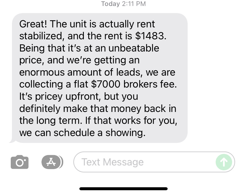 Another listing in the Bronx was just over $1000 a month, but in order to see it I would need to Zelle a “good faith” deposit of $500 directly to the agent. Um, no. For yet another unit, an agent promised there were no fees until signing. He collected my application, which in NYC includes requested tax returns, bank statements, letter from employer, etc. This is the sort of paperwork that is, in other parts of the country, reserved for buying a house. Then, once everything was assembled, he dropped the bomb: all he needed now was my good faith deposit, the one he had previously said wasn’t required. A good faith deposit isn’t necessarily unusual if you have been offered a lease, but collecting it before a lease is on the table is super shady. Imagine that even if the fee was refunded if you are rejected, it will take time to get it back, then multiply that fee by all the applications you need to fill out before you get an acceptance. That’s a lot of cash, and in truth, you probably aren’t getting it back. I learned to ignore any listing from an office that began with an A, a B, or Queens.